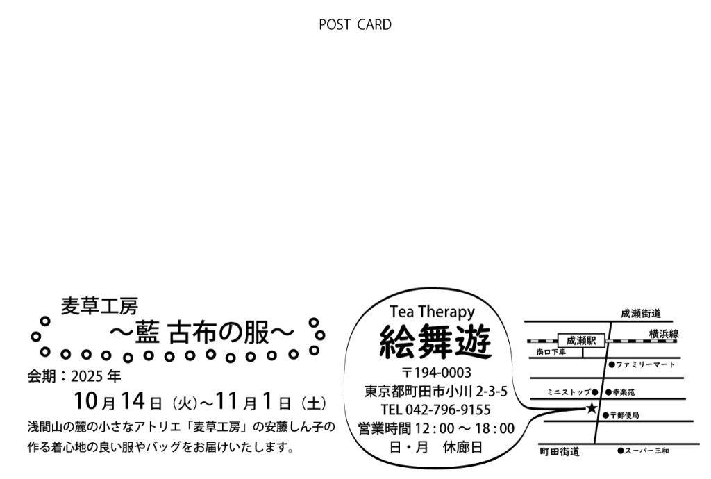 町田にてお届けいたします。 投稿日: 2025年10月31日2025年10月31日 投稿者: andoshinko ただいま東京都町田市のアトリエに出品しております。ぜひお立ち寄りください。 浅間山の麓の小さなアトリエ「麦草工房」の安藤しん子の作る着心地の良い服やバッグをお届けいたします。 2025年10 月 14 日(火)~11 月 1 日(土) Tea Therapy 絵舞遊 〒194-0003東京都町田市小川 2-3-5TEL 042-796-9155営業時間 12 : 00 ~ 18 : 00日・月 休廊日